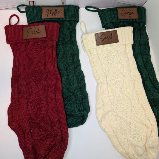Personalized Knit Christmas Stockings with Engraved Name Patch