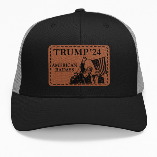 Trump 2024 American Badass Hat – Patriotic Fist Pump – Leatherette Patch